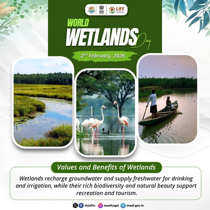 नई दिल्ली, 02 फ़रवरी (प्रेस ब्यूरो)। केंद्रीय पर्यावरण, वन एवं जलवायु परिवर्तन मंत्री भूपेंद्र यादव ने कहा कि वेटलैंड (आर्द्रभूमि) केवल प्राकृतिक पारिस्थितिकी तंत्र नहीं हैं, बल्कि ये समुदायों, संस्कृति और आजीविका का भी आधार हैं। उन्होंने कहा, “जल ही जीवन है और वेटलैंड पृथ्वी की जीवनरेखा हैं।” विश्व आर्द्रभूमि दिवस 2026 के अवसर पर सोशल मीडिया प्लेटफॉर्म ‘एक्स’ पर दिए गए अपने संदेश में मंत्री ने बताया कि प्रधानमंत्री नरेन्द्र मोदी के पर्यावरण-संवेदनशील नेतृत्व में भारत ने वेटलैंड संरक्षण को समुदाय और संस्कृति से जोड़ा है। उन्होंने कहा कि 2014 में भारत के पास केवल 26 रामसर स्थल थे, जो अब बढ़कर 98 हो गए हैं, जो देश की एक बड़ी उपलब्धि है।